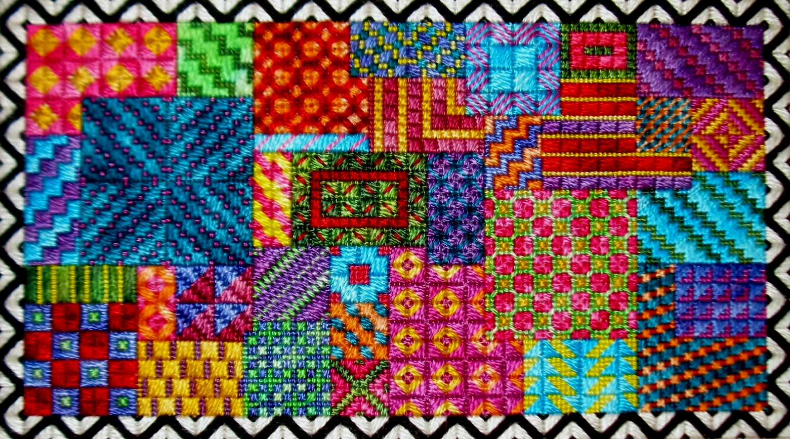 And here it is in the alternate colorway listed on the pattern. I’m using threads from the Magenta & Sunshine Color Delights patterns. You’ll see there’s a border started on the left side of the photo and pencil lines to the right. This is the start of a large project combining 12 of the Double Delights patterns. A free chart for this border will soon be available on my website (it’s on the way to the Auto shops!). The cool thing about this border outline pattern is all the “Delights” patterns, Color or Double, fit in the blocks. There’s plenty of room here for creativity and color options!