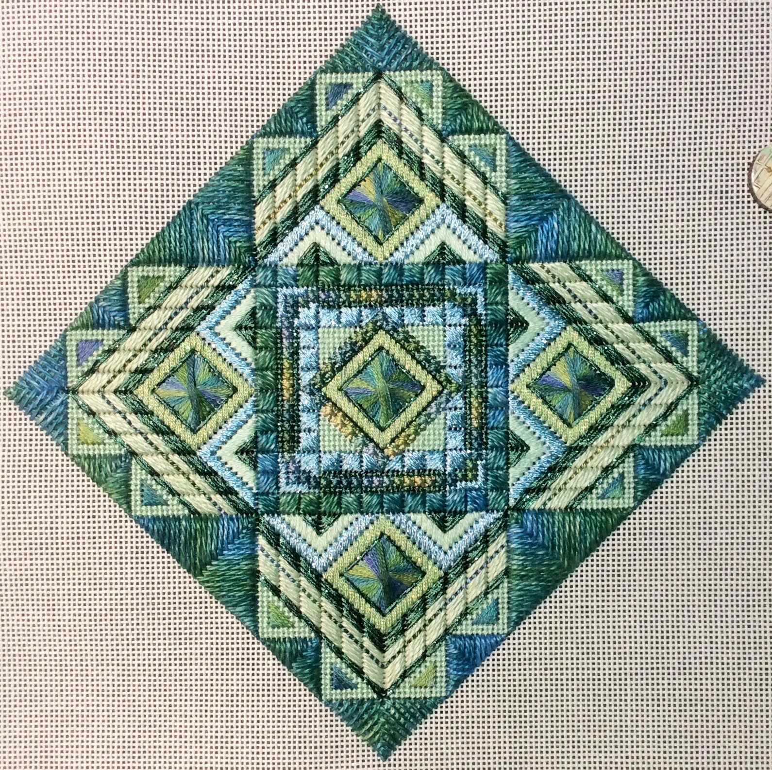 to decide whether it should be a square or a diamond shaped design! While I designed and stitched it as a diamond, I took the appearance of it as square into consideration when I was choosing what to stitch where. I’d not done this before so it was a fun exercise – it’s good to stretch and try something new. It’s always amazing how turning or rotating a design gives it a different look.