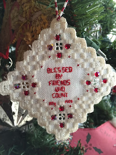 Our group named itself “Friends who Count” and this ornament was another Debbie’s (we had lots of Debbies just like my high school classes!!). She added the words to this hardanger and included her initials and the year. Since I haven’t done much hardanger, I appreciate having it and remembering her when I add it to my tree. She moved away a long time ago.