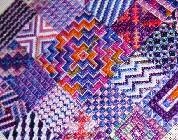 The bad news is I’ve been sick with a bad cold/sinus thingy. The good news is I did a lot of stitching over the weekend because I didn’t have the energy to do anything else. My colorful piece is coming along nicely although I wish I knew what I’m going to call it! Here’s a little more for you to see…this piece will be released towards the end of February. The unstitched area between the larger and smaller squares is what I call an “inside border”. I’m not completely certain of what I’m doing here…still considering a few options.