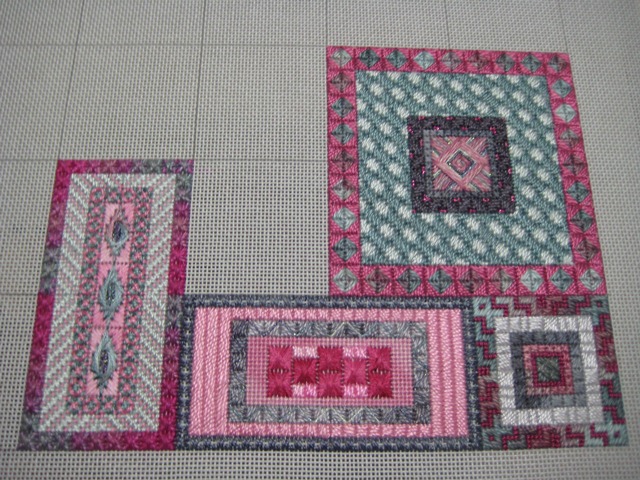 Don’t scroll down unless you want to see a photo of my current Mystery project in process. These are the first three month’s patterns. I’m just about done stitching the whole design so I have to cut and paste to edit the photo to not show it all. I have it all charted but have been writing the instructions a month at a time. I wrote the April instructions this weekend though so I am finally ahead of the game on something – this doesn’t happen often enough for me!