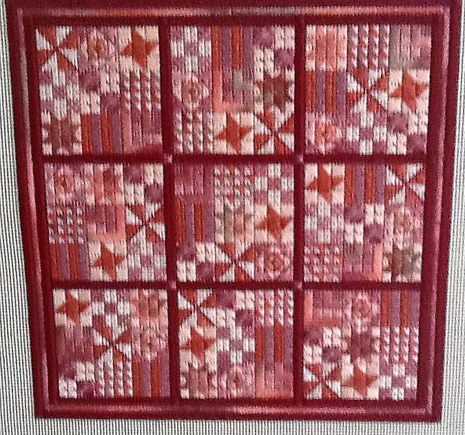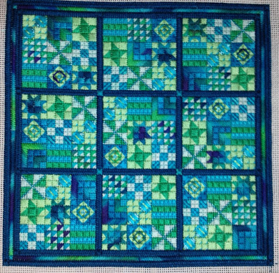 I’m done stitching and almost done writing instructions for my Nashville releases – this is the earliest I’ve ever been ready for a tradeshow and it feels wonderful! One of my new releases will be Sudoku Delight – this was a class I taught a few years ago and I’ve had a lot of requests for this pattern. In addition to my original colorway, eight other colorways are listed. This is my Original and the main thread is called Peacock. Most of the colorway names are based on the Rainbow Gallery Bravo overdyed thread which was the inspiration for each colorway.