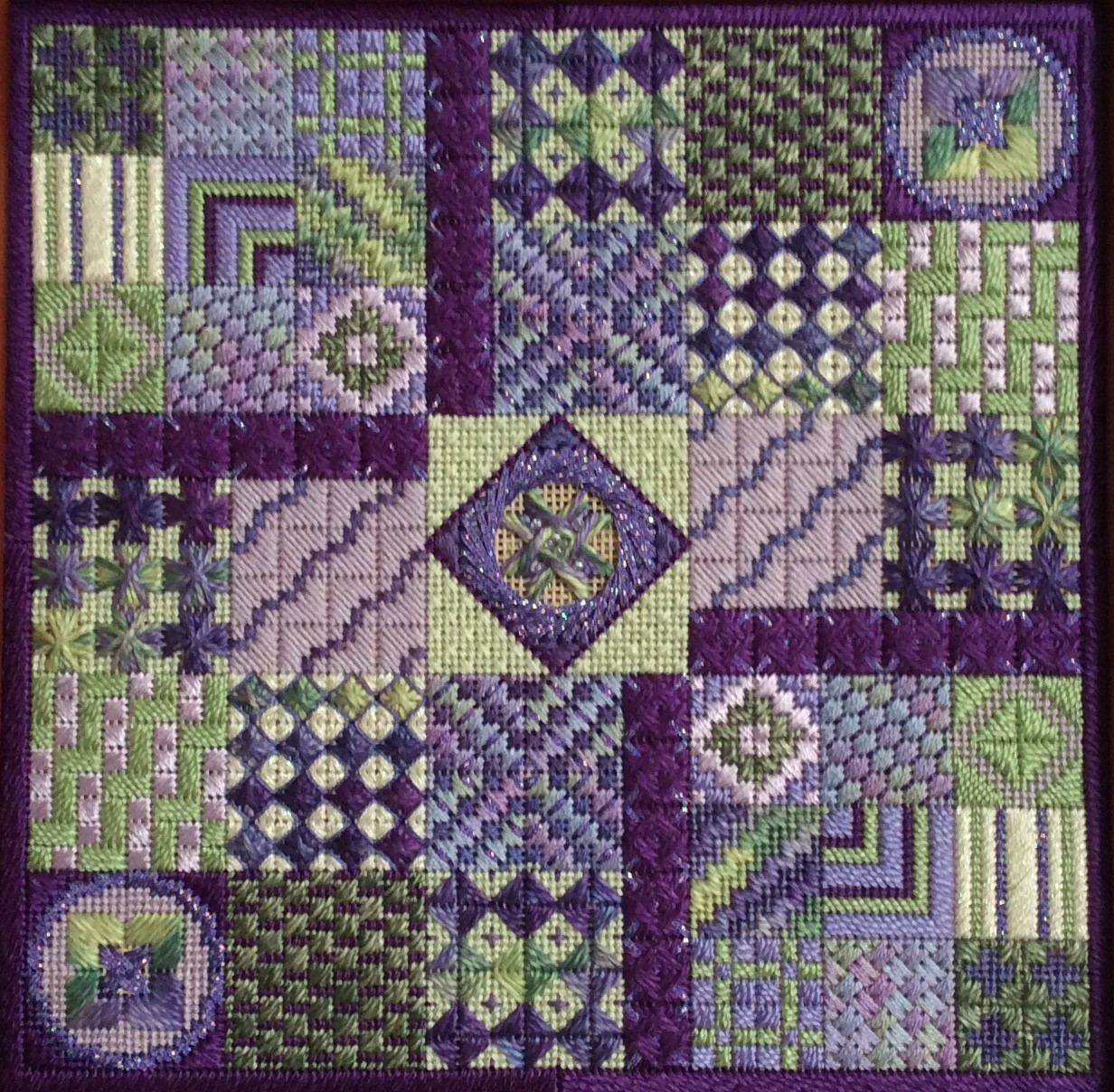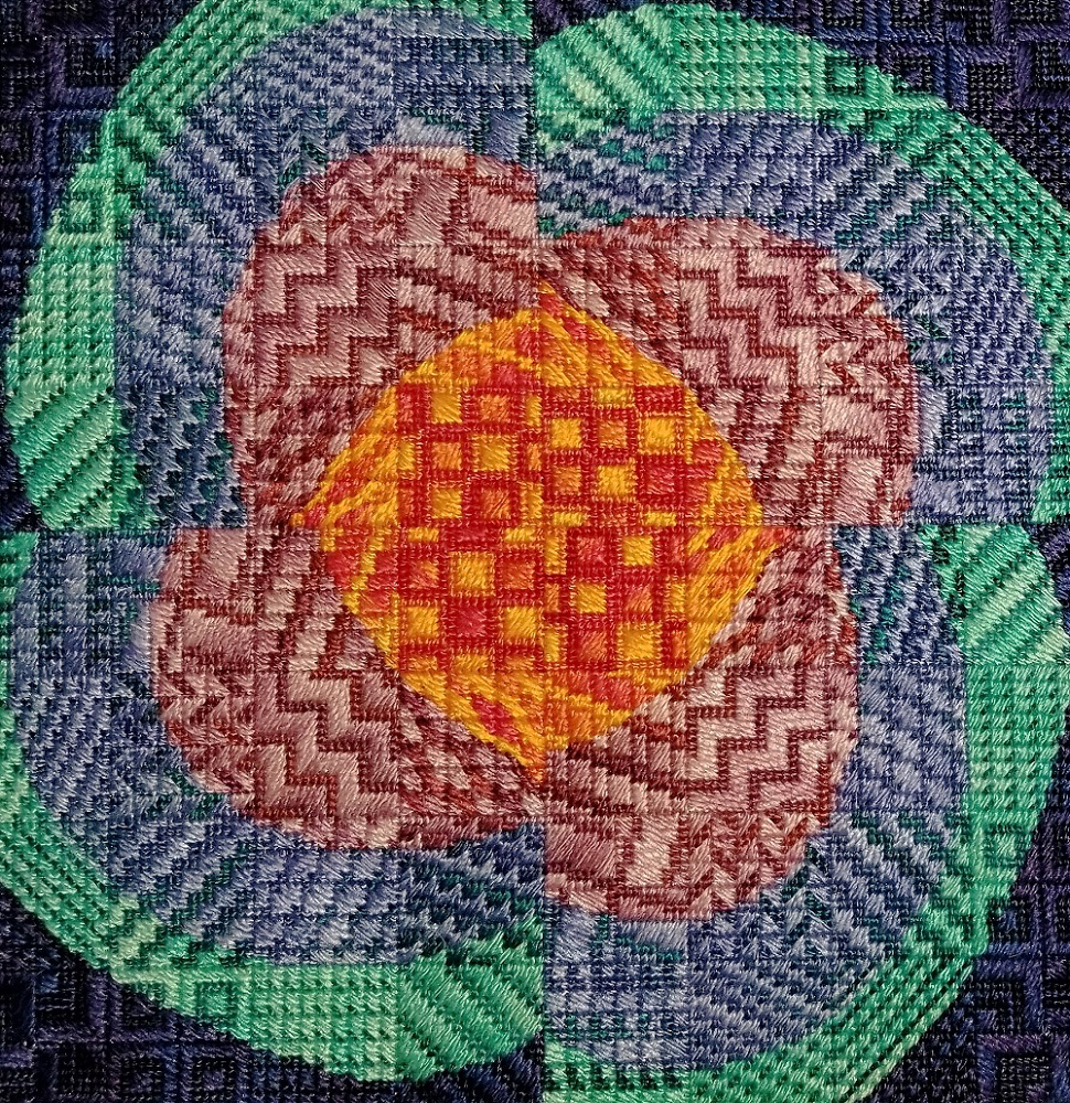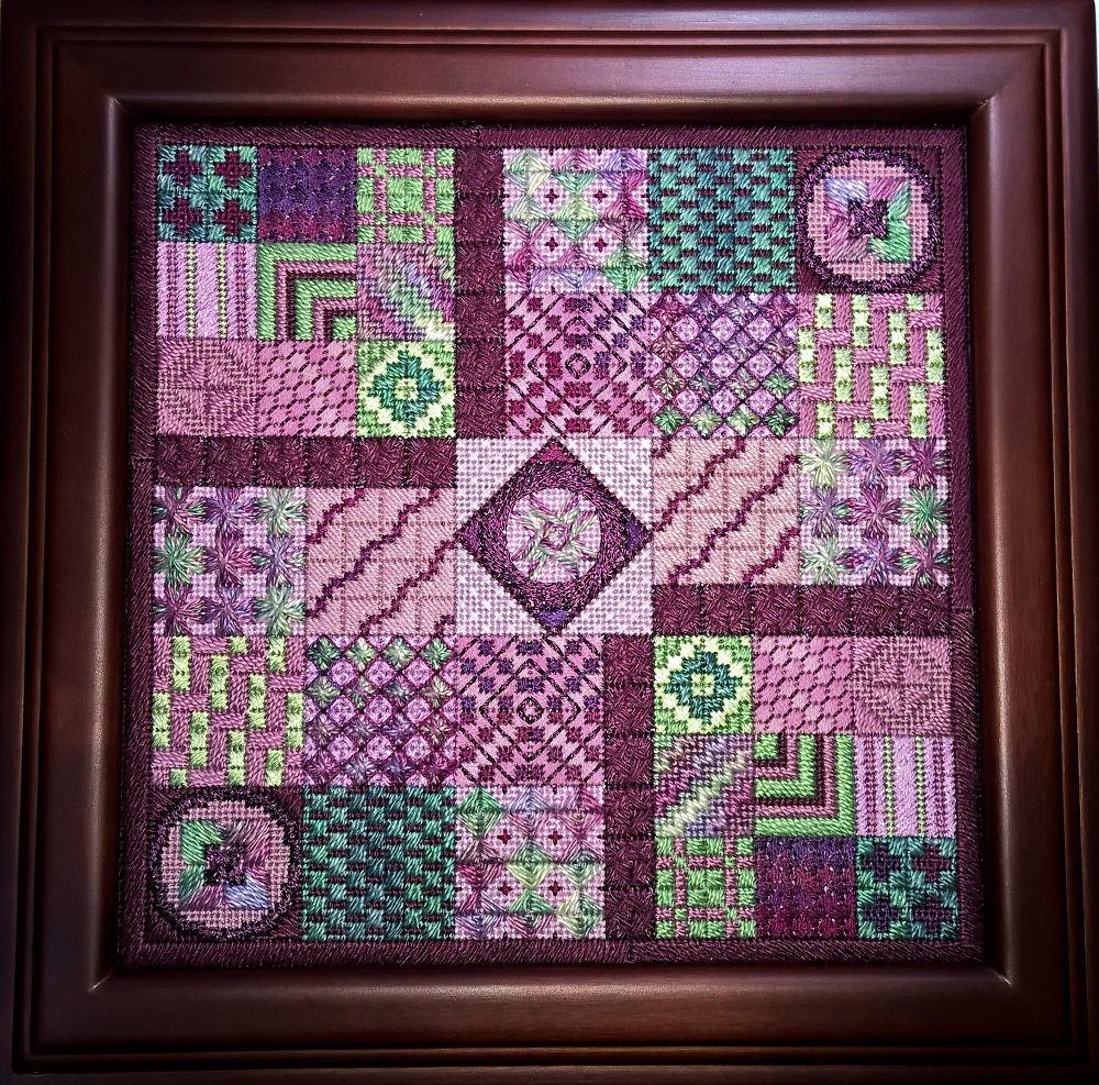 Last up is Amethyst Garden. I taught this online a couple of years ago and am now making it available to all. There are NINE alternate colorways listed in the pattern. I let a little canvas peek through behind the star in the center so the design is worked on the color “Sandstone” canvas and the alternate colorways suggest complementary canvas colors to the threads.