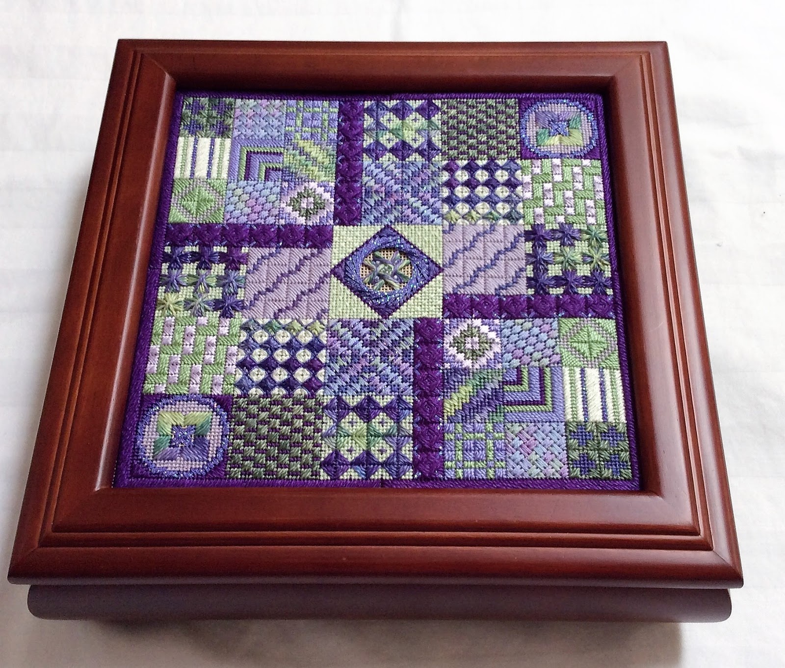 I put my Amethyst Garden in a Sudberry box (Carol’s Fancywork). It’s a mahogany box and sets this design off perfectly.