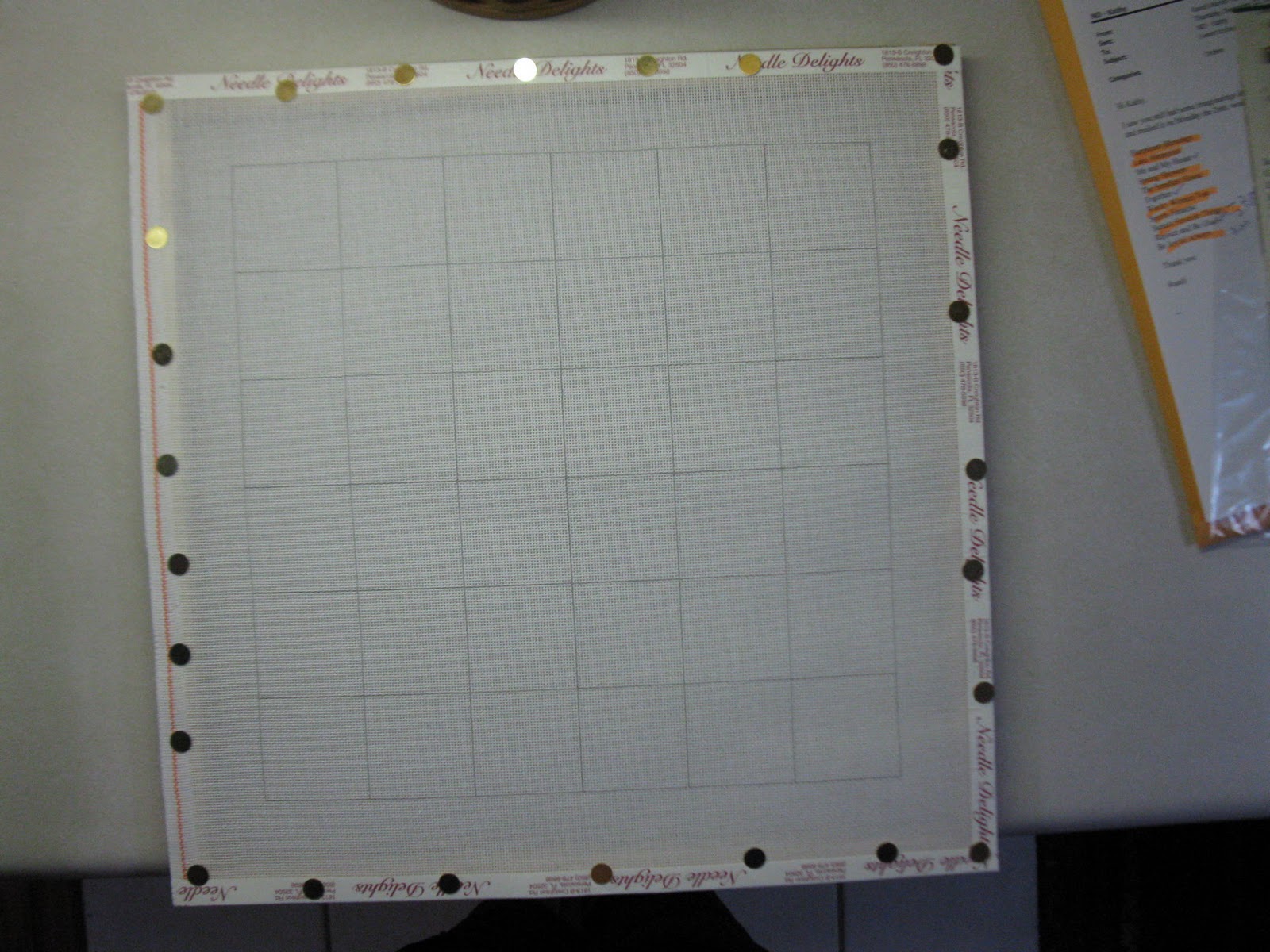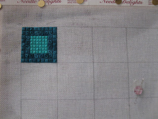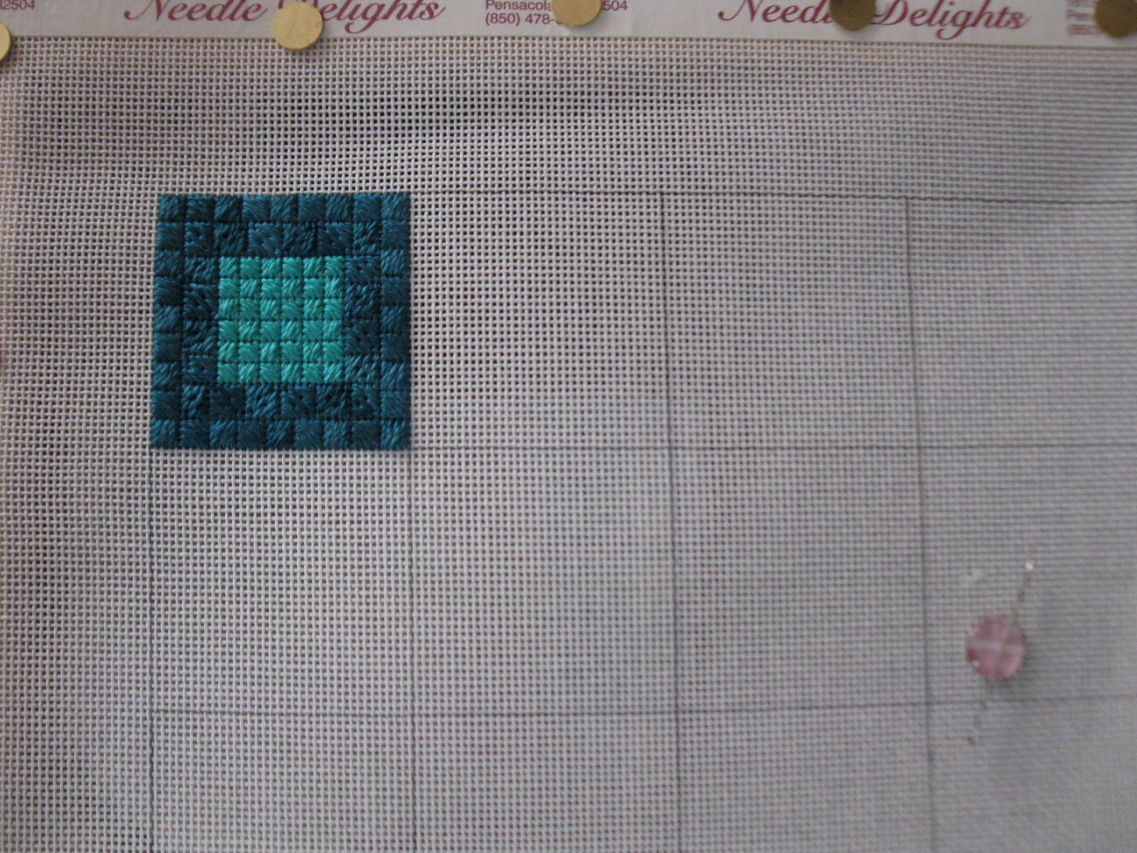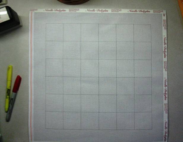 For this new piece, I decided on large squares 36 by 36 threads. There will be six squares across and six squares down. First, I find the center of the canvas (I use a long ruler) and make a cross where the intersection is the center of the canvas.