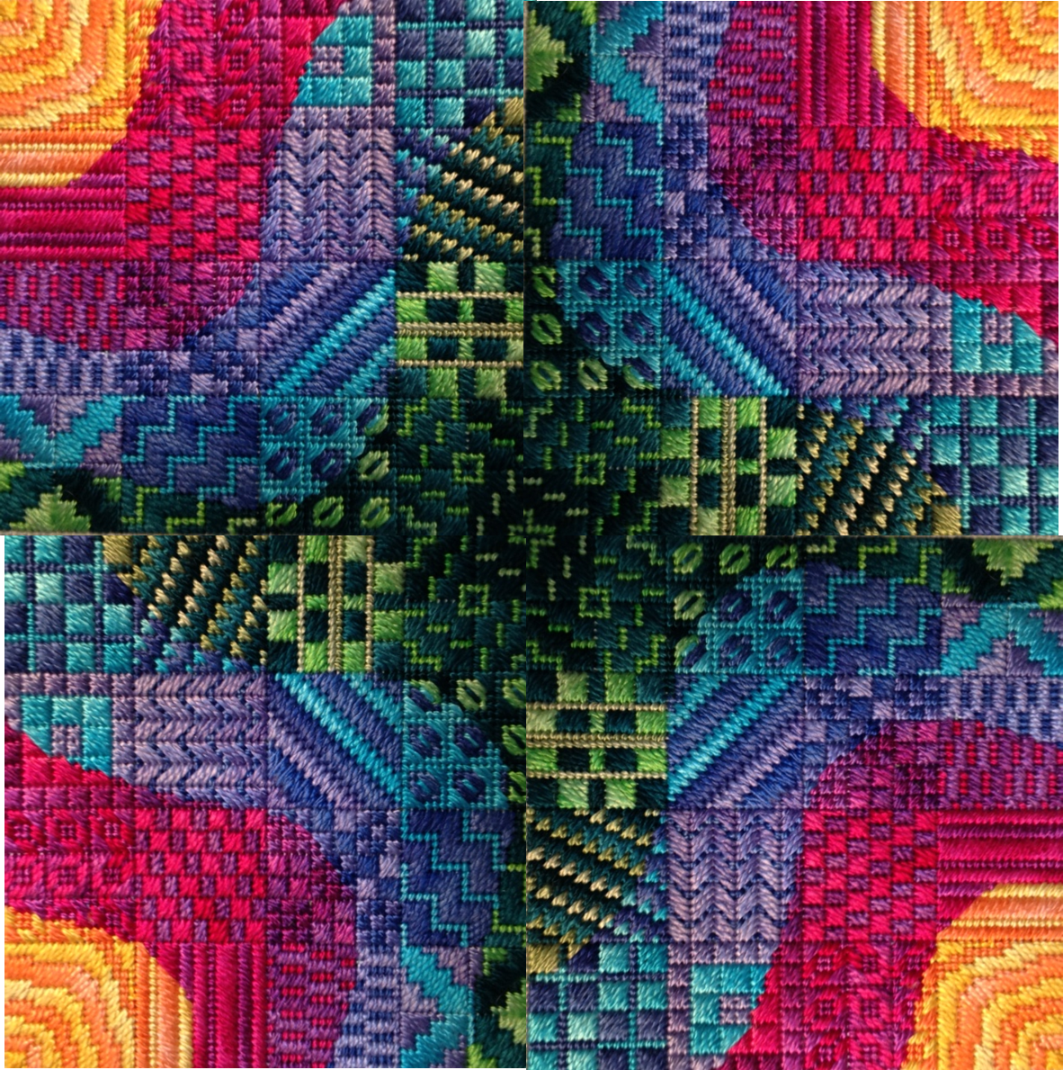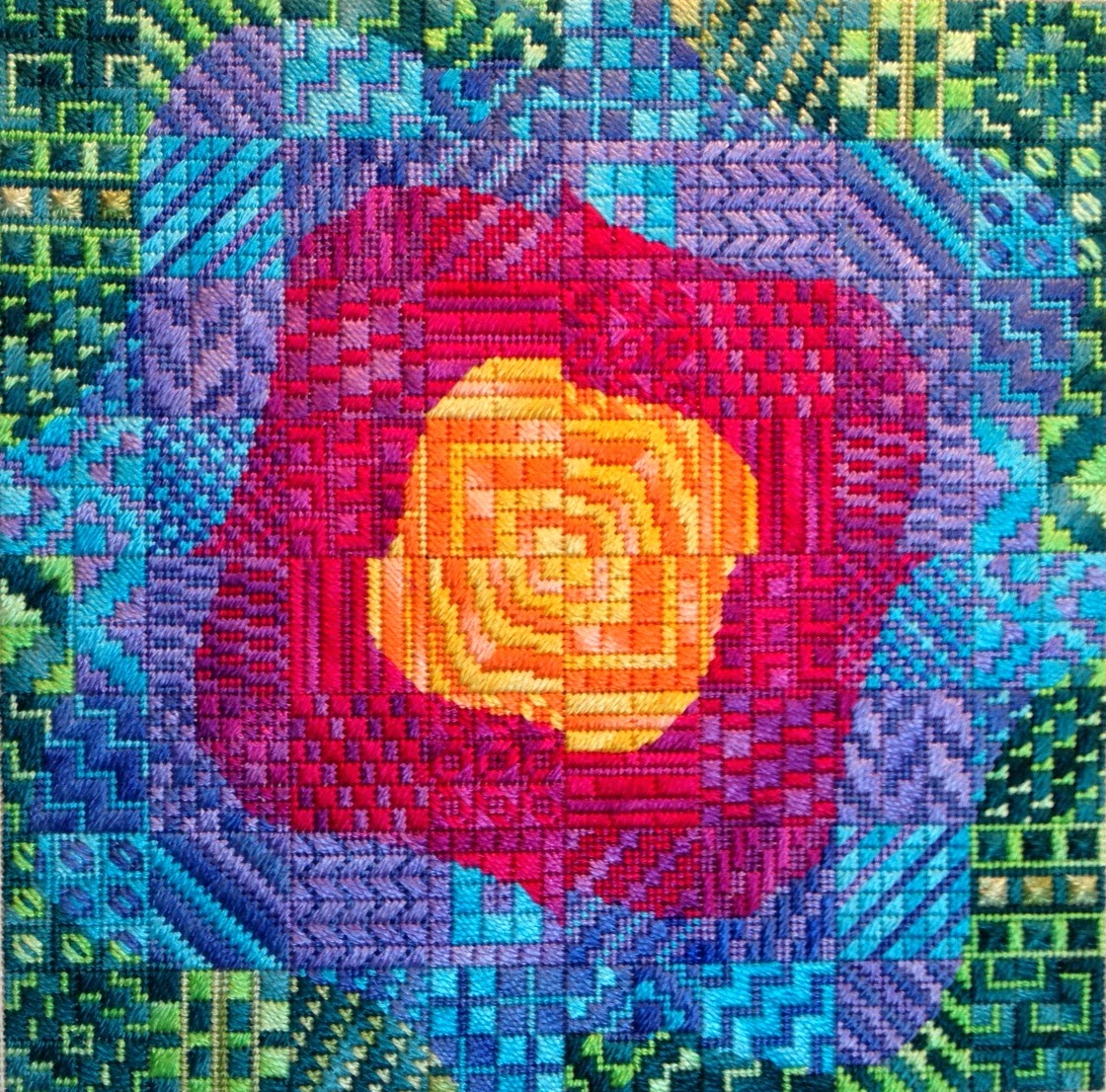 I’m excited to announce the creation of a new series and show you the first offering. After I finished designing and stitching Colorwaves, I was inspired to create more “waves of color” but on a smaller scale. Thus, … ripples, which are just small waves. So I stitched this…