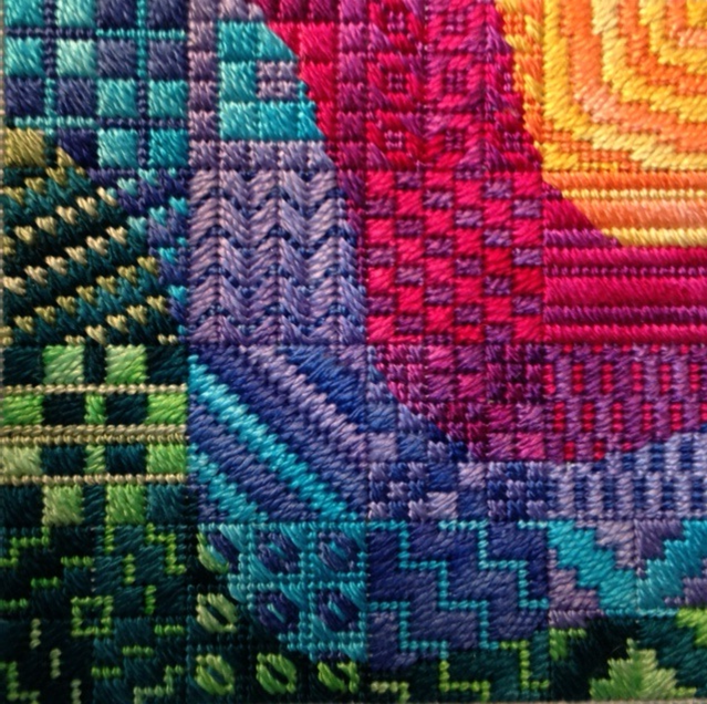 I’m excited to announce the creation of a new series and show you the first offering. After I finished designing and stitching Colorwaves, I was inspired to create more “waves of color” but on a smaller scale. Thus, … ripples, which are just small waves. So I stitched this…
