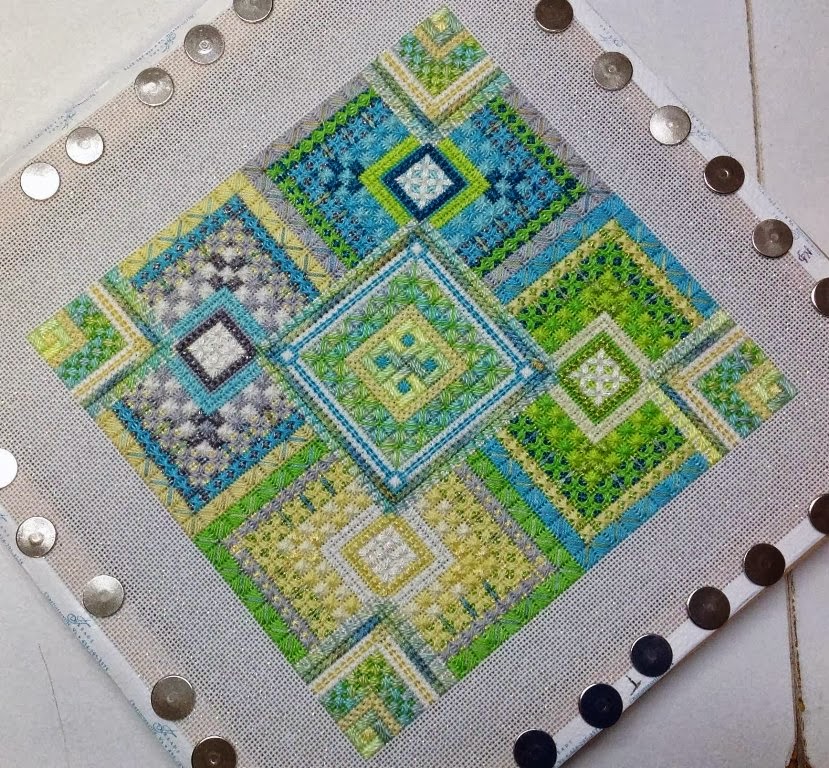 I received this photo from Gretchen at Threads, LLC in Charlottesville, VA (http://www.threadsinva.com/) – she took Color Delights “Shamrock” and modified and enlarged the design by repeating it and changing the colors. I think she made it fabulous. She told me they’re also stitching it in a jewel tone colorway and will be offering it as a future class. I love what she did with it – it made me think “Shamrock Garden”! I can’t wait to see the jewel tone version!