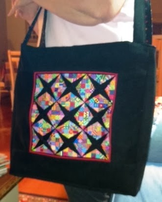 Before I went left for National Seminar, my mom made a quick visit and brought some finishing she’d done for Marilyn H. in Texas to show me. She made BlackJack into a fabulous tote bag and here are a few photos of it. I wish I could have kept it!