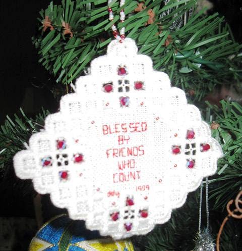 The photo above shows the back of the previous ornament – the person who stitched it NEVER did cross stitch (she was/is a master of canvaswork) and wondered what she was thinking when she picked this out to do. I asked her to sign it and I love having it signed and dated. I think it’s a great idea – if you make ornaments as gifts, be sure to put the date on it! Sue: If you’re reading this, 1997?? Where has the time gone?