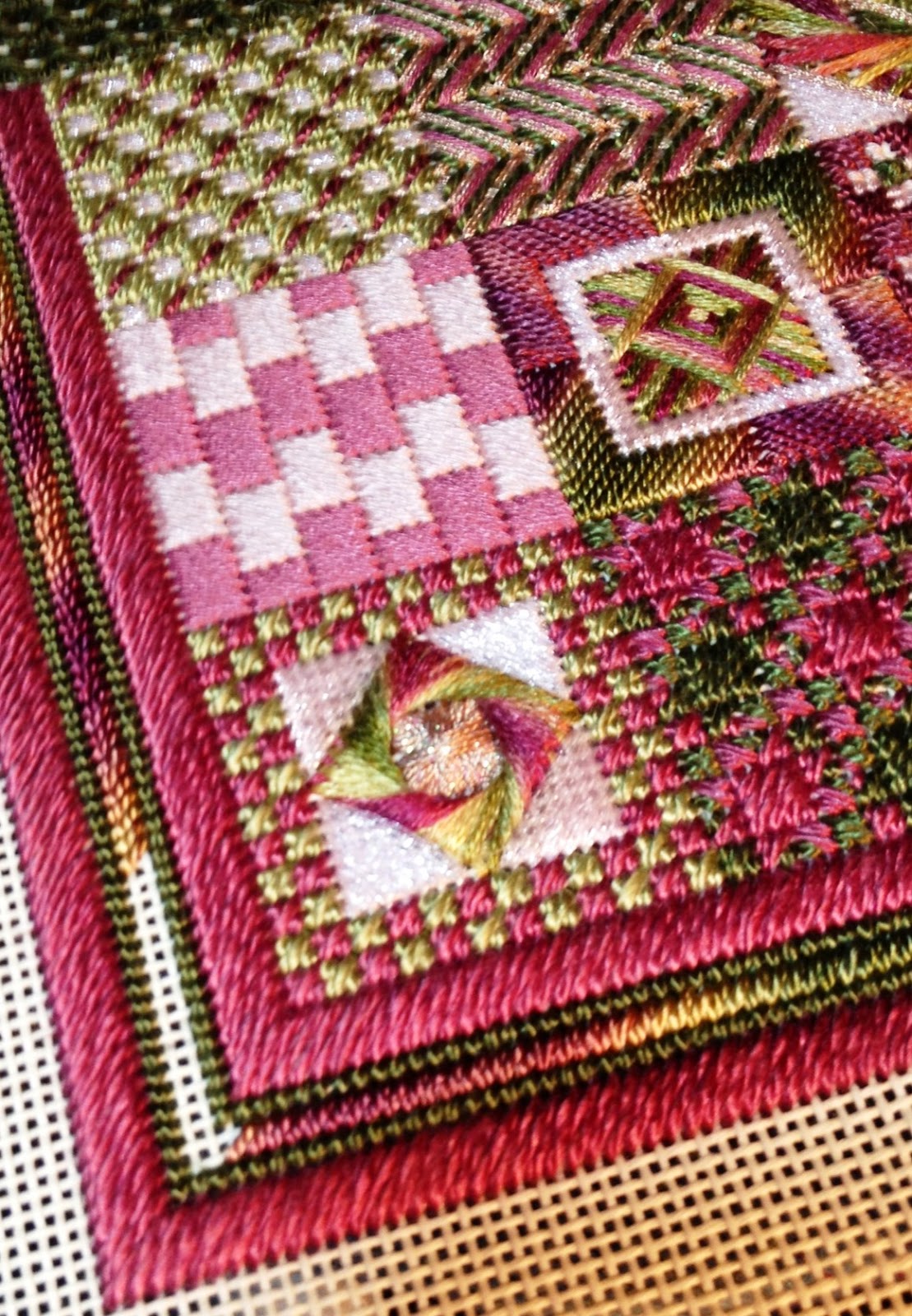 On a positive note (after my whining above), my Serenity design won a 2nd place ribbon in the exhibit at the Callaway Gardens Needle Arts seminar. I went up for a couple of days earlier this week to see the exhibit and shop in the boutique (wish I’d know I’d need that thread!). Serenity is a new teaching design and if you haven’t seen it, here it is – I haven’t got it up on my website yet. I designed it to be vertical but the picture of it framed below shows it horizontal – it’s interesting to see how the orientation makes it look different. It showed up this way when I added it to the blog so I decided to leave it instead of fixing it to demonstrate this phenomenon. It’s one of the fun things about geometrics – you can hang them however they most appeal to you or sometimes which way they’ll fit better on a wall or in a grouping.
