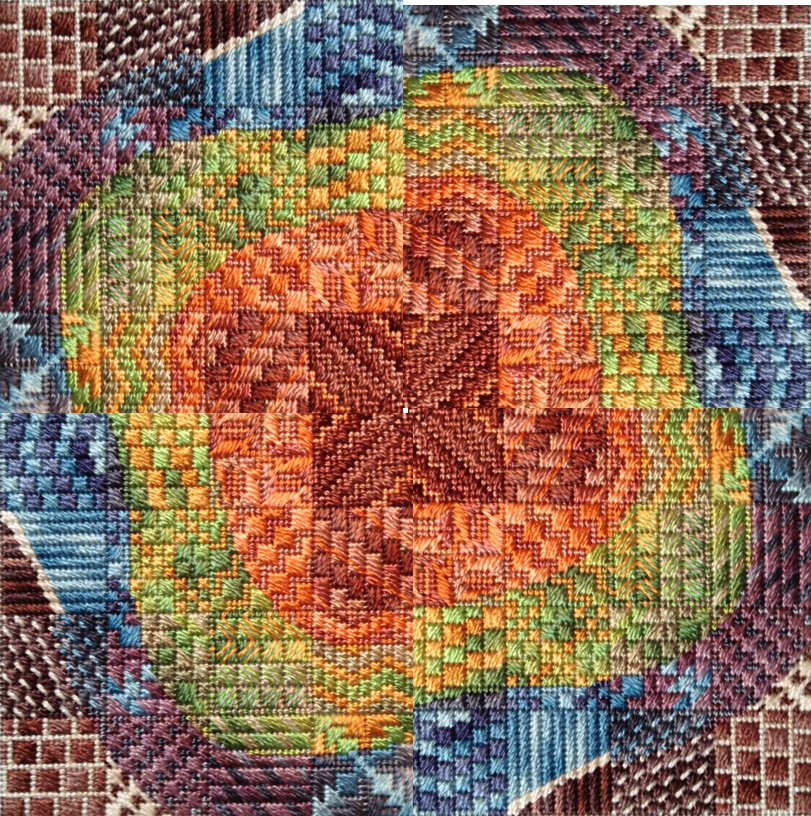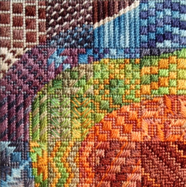 when I’m having fun and creating new designs! I’ve been super busy the last few months working on all kinds of secret projects. I’m almost done stitching a large Mystery design that will soon be available as an online class. This is my fifth Mystery design (you can see the others here) and I think it’s my favorite! I used colors I personally love (turquoises, purples, and limes) to stitch my original and have created additional colorways so there’s something for everyone. I’m also working on a couple of new teaching pieces and I always have a new Color Delights on stretcher bars for times when I have to sit and wait somewhere.