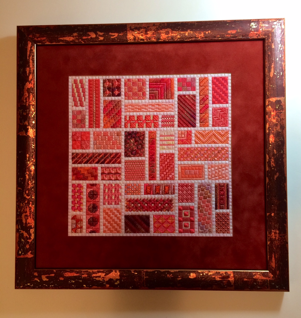 The next two photos show the Melon colorway – the first is done with light borders like my original version and the second version is done with dark borders. I had a student who requested a “darker look” so I changed only the border color to make the piece more dramatic to suit her personal taste and décor. It’s amazing what changing just the border color does to the look of a piece. The framing also affects the overall look – I was pleased with both of these students’ work.